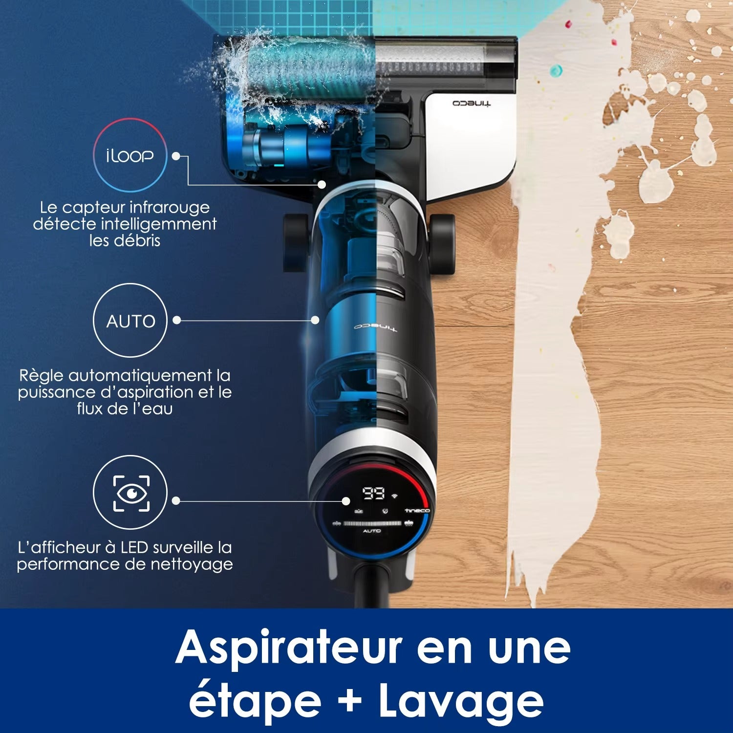 Un aspirateur intelligent qui combine aspiration et lavage humide pour un nettoyage efficace et simplifié.